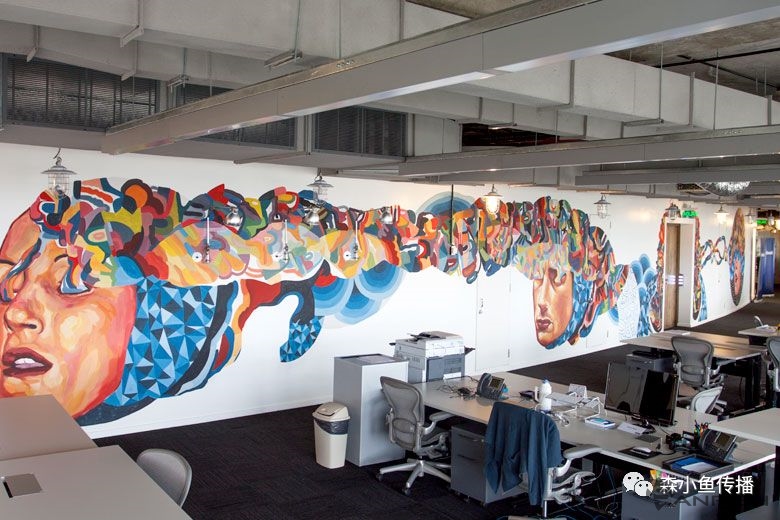墻面適合表達(dá)的,應(yīng)該是相對(duì)恒久固定的,相對(duì)抽象和偏精神層面的。通過精妙的圖形、簡(jiǎn)約的文字、巧妙的裝飾營(yíng)造恰當(dāng)?shù)姆諊寙T工身處其中,感覺到美和舒適的同時(shí),還能和其產(chǎn)生積極的情感連接。比如我們看國(guó)外很多互聯(lián)網(wǎng)公司的例子: